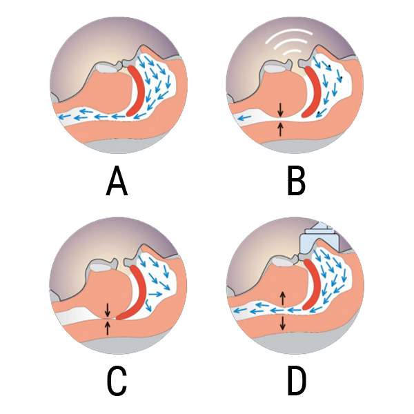 This diagram is a helpful visualisation of what typically occurs for someone experiencing OSA. During normal sleep (A) , the muscles that control your tongue and soft palate hold the airway open. If these muscles relax, your airway will become narrower (B) and the soft or floppy part of the throat vibrates; the noise of snoring results. If your throat is already narrow, or the muscles relax too much, your airway can become completely blocked (C), which prevents breathing. This can be mitigated through the use of a Continuous positive airway pressure (CPAP) machine (D).