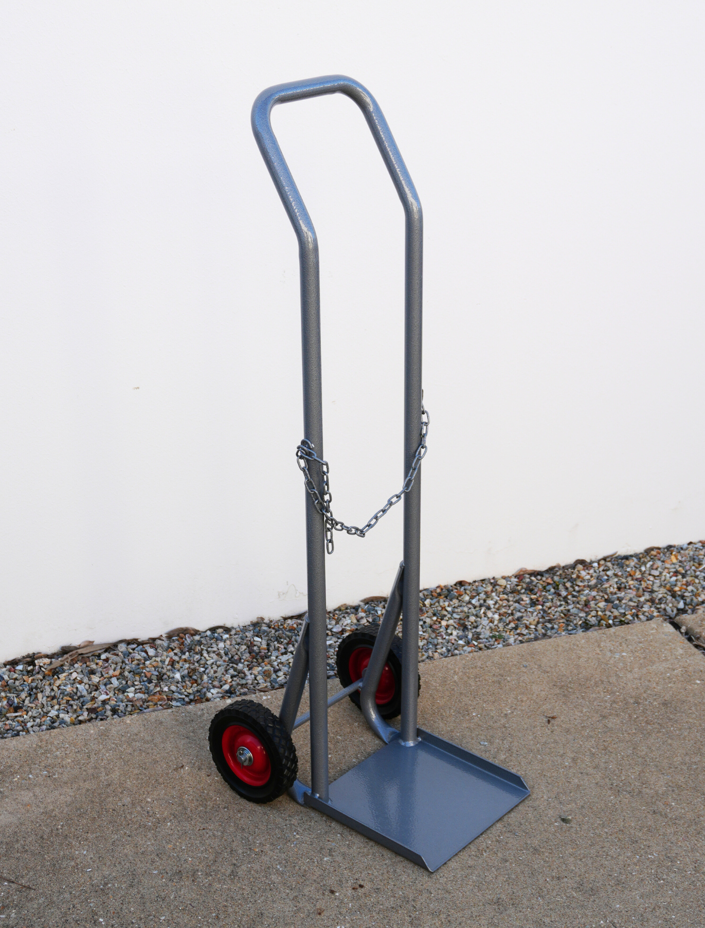 You can transport and store an E-Size Oxygen cylinder securely and safely with this high quality steel trolley. This cylinder holder is designed to avoid tipping and the oxygen is kept secure and upright with a chain lock mechanism. Large wheels allow for easy movement.